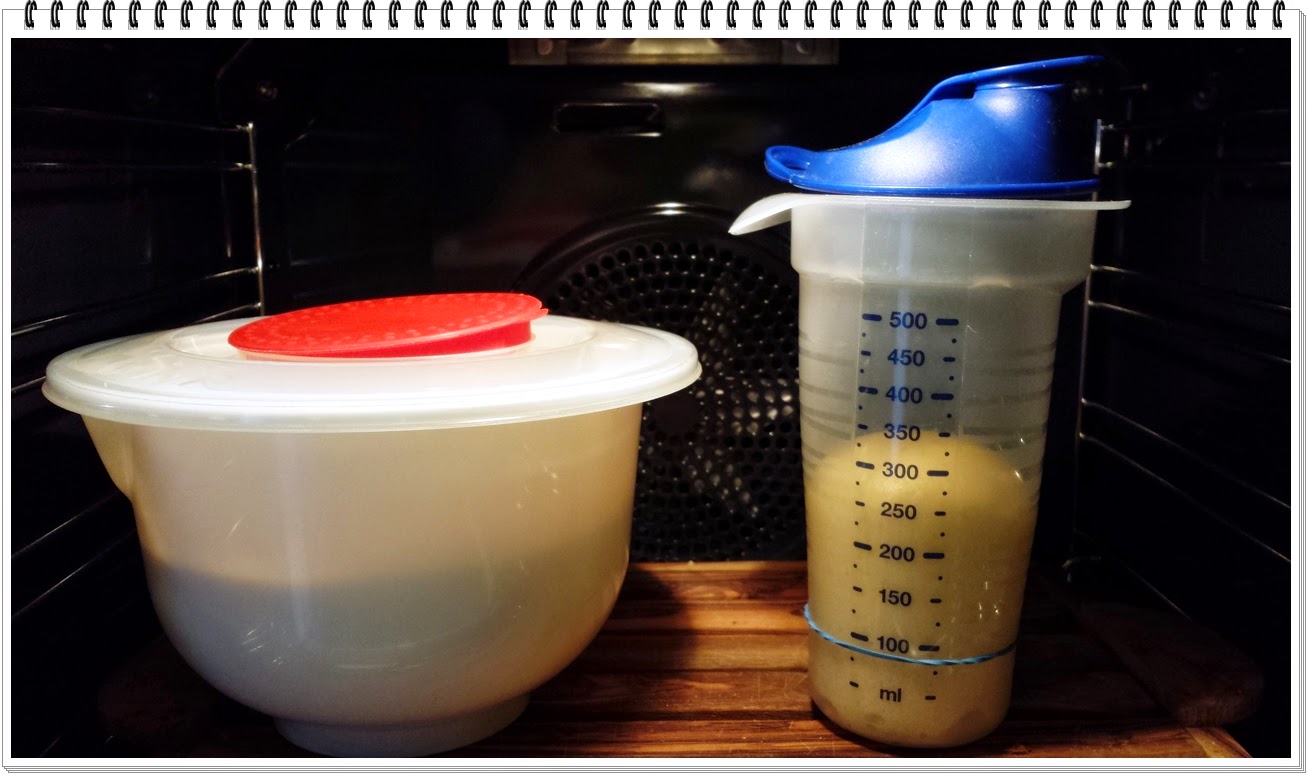 9) mettere l'impasto in un contenitore abbastanza capiente da contenere il triplo del volume iniziale, e la spia di lievitazione in un contenitore graduato per tenere sotto controllo lo sviluppo dell'impasto