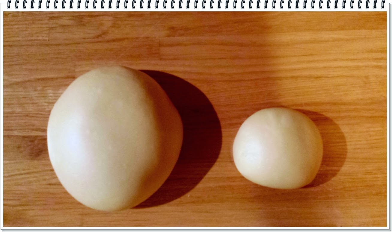 8) staccare un piccolo pezzo di impasto, che servirà da spia di lievitazione, e pirlarlo fino ad ottenere una palla liscia e setosa; effettuare la stessa operazione con il resto dell'impasto ottenendo un'altra palla che differisce dalla prima solo nelle dimensioni