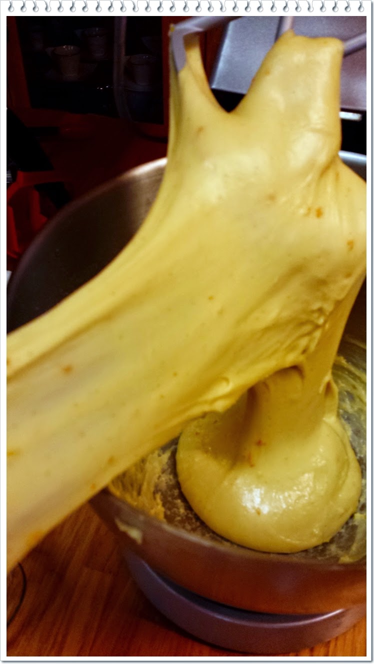 7) fare la prova del velo per verificare lo stato dell'impasto. Se non risulta ancora ben incordato continuare ad impastare fino a completa incordatura (con eventuali soste di raffreddamento in frigo)