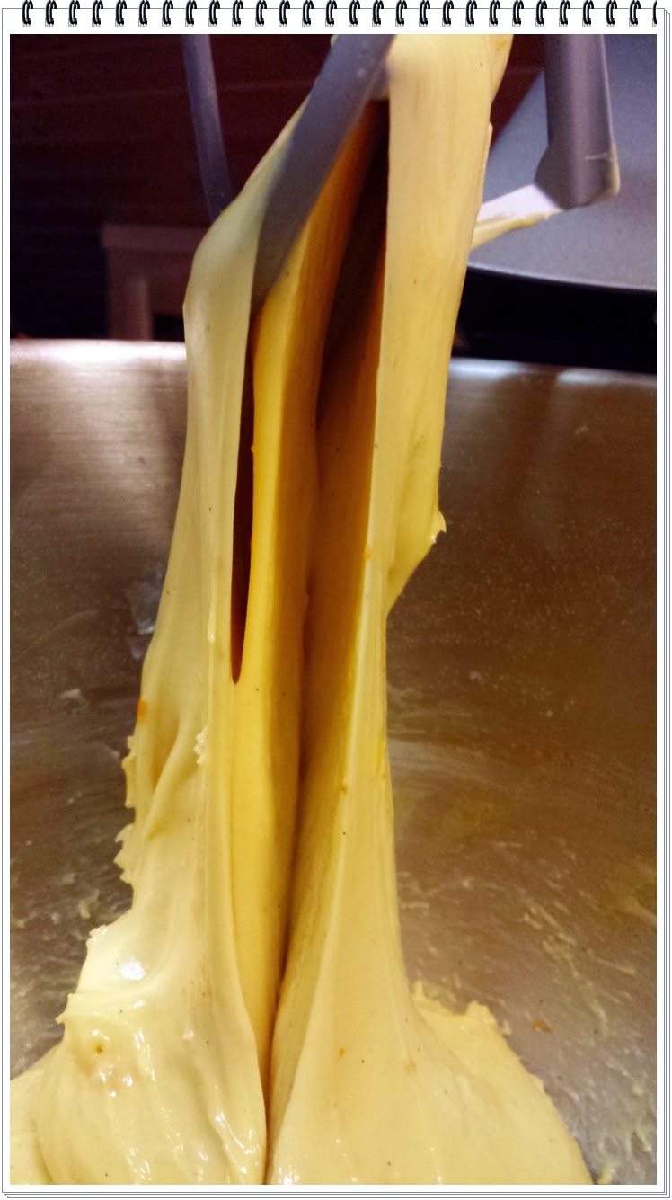 4) una volta assorbito il tutto aggiungere 120 gr di burro e, sempre gradatamente, la seconda metà dei tuorli, ed impastare quanto basta per raggiungere l'incordatura