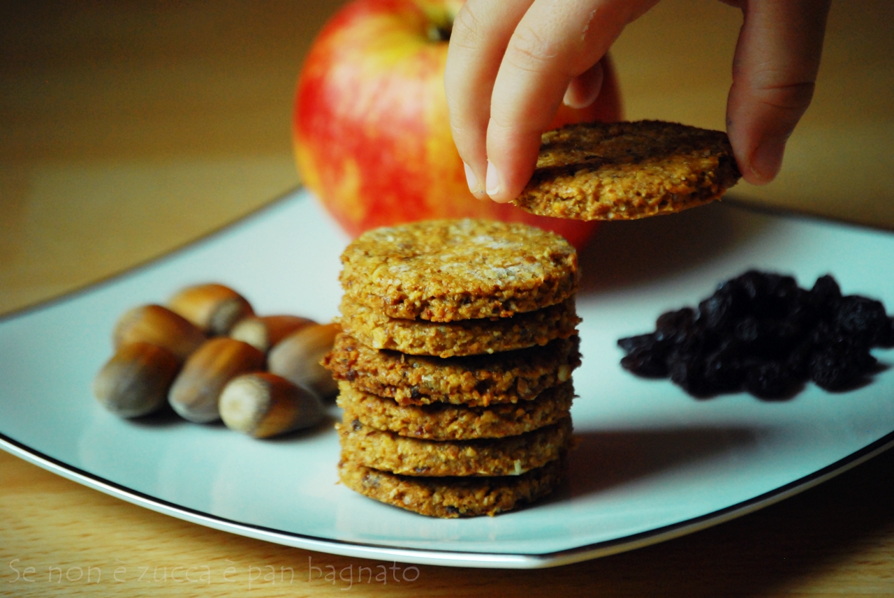 Frullate i fiocchi d'avena, la mela con la buccia tagliata a tocchetti e le nocciole: a seconda del tempo e grado di macinazione otterrete dei biscotti più o meno rustici.