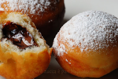 La ricetta originale dei krapfen prevede che siano riempiti con confettura di albicocche, io ne ho preparati alcuni anche con la Nutella, perchè il mio piccolo Alessio, contrariamente alla grande maggioranza dei bambini, detesta la marmellata..